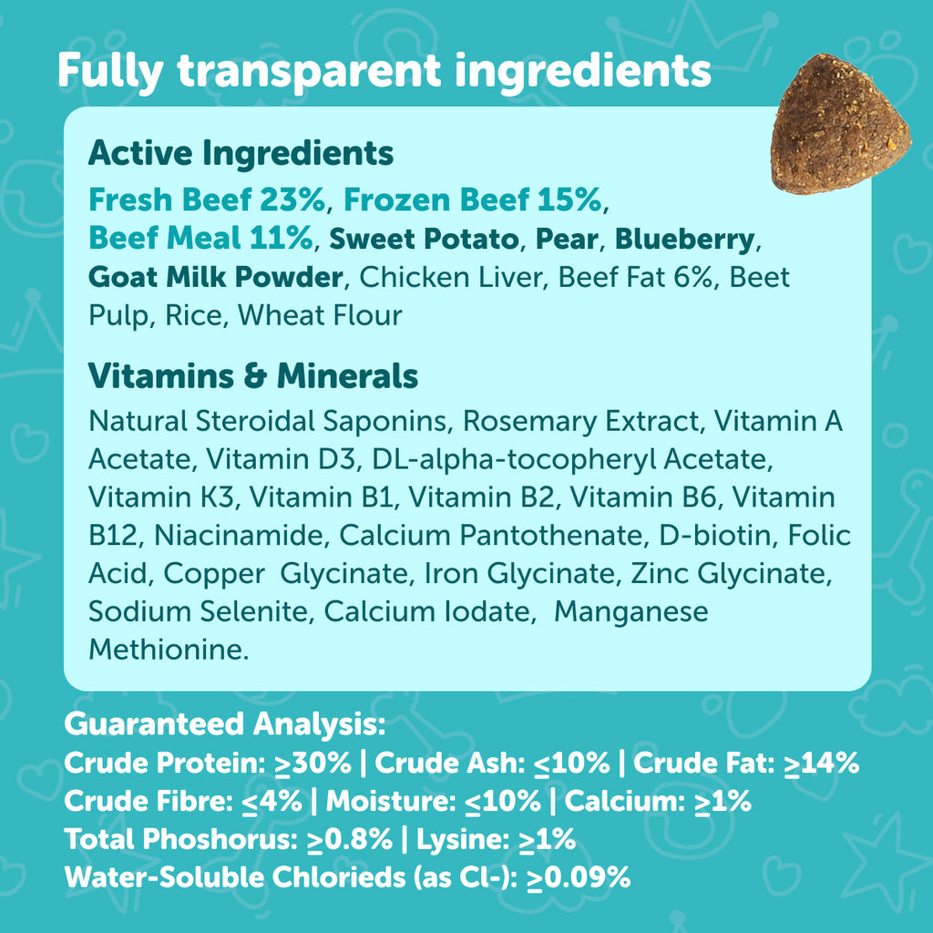 Fresh Beef 23%, Frozen Beef 15%, Rice, Beef Meal 11%, Wheat Flour, Sweet Potato, Chicken Liver, Beef Fat 6%, Beet Pulp, Pear, Blueberry, Goat Milk Powder